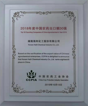 金秋收獲季,碩果采摘時。日前,在上海召開的第十九屆全國農(nóng)藥交流會上傳來喜訊,隨著2018年度中國農(nóng)藥出口額30強出爐,海利集團旗下湖南海利化工股份有限公司以第18順位閃亮晉榜。